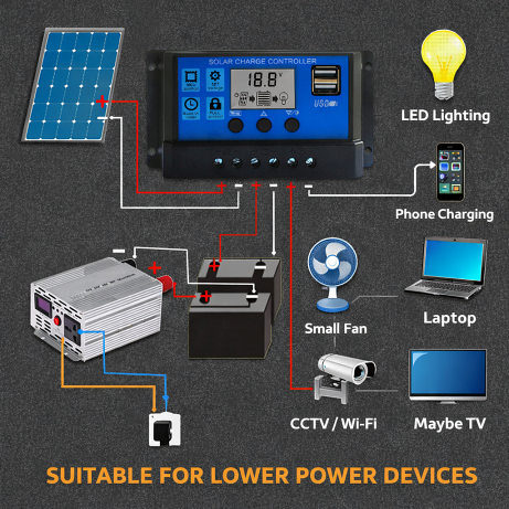 This small off-grid solar system is designed for low power usage and is suitable for areas where grid electricity is not available or not practical.